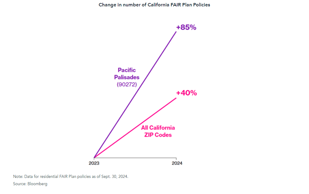 The recent wildfires in California have significantly impacted insurance companies, leading to substantial insured losses. Some insurance companies have tried to mitigate their risk and avoid certain areas. For instance, State Farm dropped around 1,600 policies in Pacific Palisades before the fires, reflecting a broader trend of insurers pulling back from high-risk areas. Allstate and Farmers Insurance have also halted underwriting in certain regions of California, leaving many homeowners relying on the California FAIR Plan (FAIR Plan).