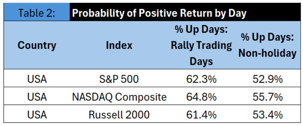 Additionally, the probability of positive returns is higher during the Santa Claus Rally compared to other trading days.